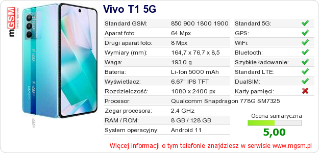 Dane telefonu Vivo T1 5G na Twojej stronie