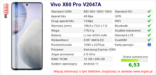 Dane telefonu Vivo X60 Pro V2047A na Twojej stronie