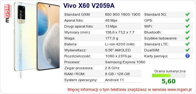 Dane telefonu Vivo X60 V2059A na Twojej stronie