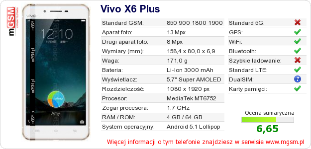 Dane telefonu Vivo X6 Plus na Twojej stronie