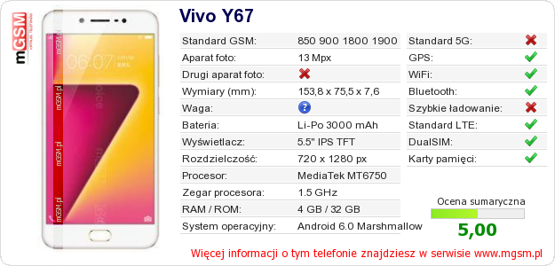 Dane telefonu Vivo Y67 na Twojej stronie