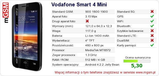 Dane telefonu Vodafone Smart 4 Mini na Twojej stronie