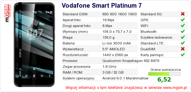 Dane telefonu Vodafone Smart Platinum 7 na Twojej stronie