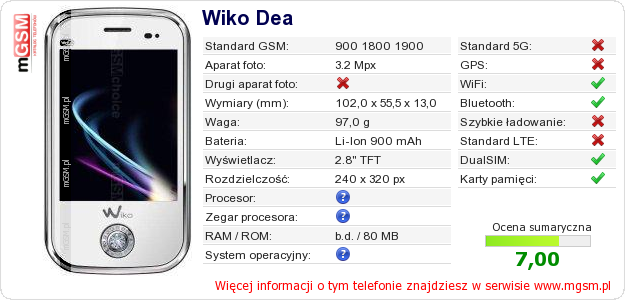 Dane telefonu Wiko Dea na Twojej stronie