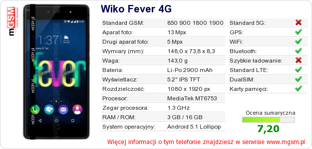 Dane telefonu Wiko Fever 4G na Twojej stronie