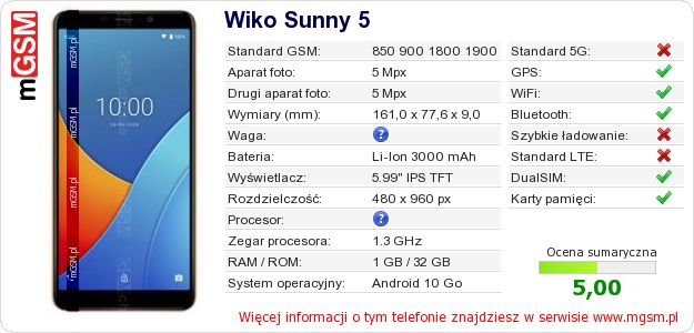 Dane telefonu Wiko Sunny 5 na Twojej stronie
