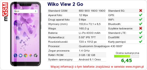 Dane telefonu Wiko View 2 Go na Twojej stronie