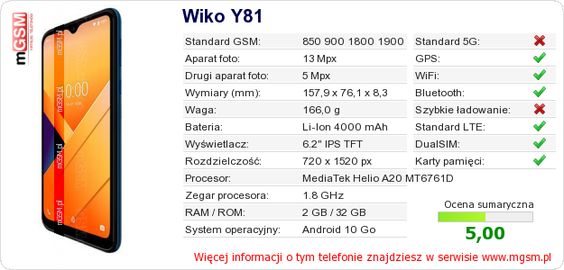 Dane telefonu Wiko Y81 na Twojej stronie
