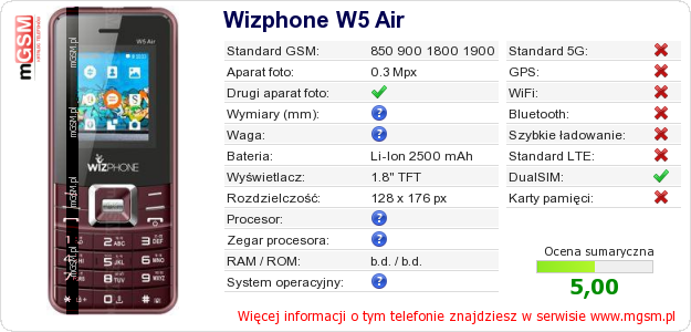 Dane telefonu Wizphone W5 Air na Twojej stronie