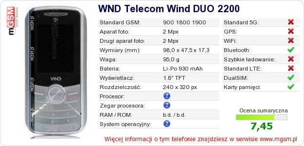 Masz swoją stronę? Chcesz wstawić gdzieś informacje o podstawowych danych telefonu WND Telecom Wind DUO 2200 ? To bardzo proste. Możesz pobrać obrazek, lub skopiować i wkleić na stronę poniższy kod:Wklejenie tego kodu spowoduje wyświetlenie poniższego obrazka: