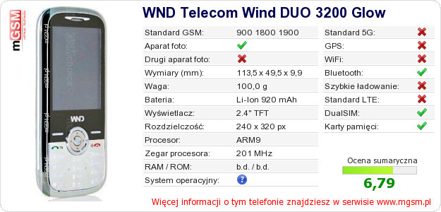 Masz swoją stronę? Chcesz wstawić gdzieś informacje o podstawowych danych telefonu WND Telecom Wind DUO 3200 Glow ? To bardzo proste. Możesz pobrać obrazek, lub skopiować i wkleić na stronę poniższy kod:Wklejenie tego kodu spowoduje wyświetlenie poniższego obrazka: