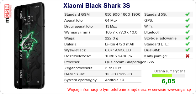 Dane telefonu Xiaomi Black Shark 3S na Twojej stronie