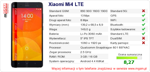 Dane telefonu Xiaomi Mi4 LTE na Twojej stronie