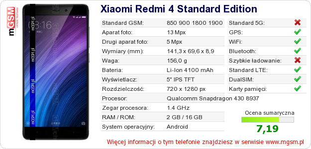 Dane telefonu Xiaomi Redmi 4 Standard Edition na Twojej stronie