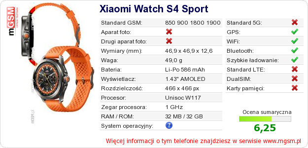 Dane telefonu Xiaomi Watch S4 Sport na Twojej stronie