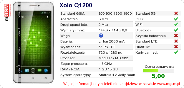 Dane telefonu Xolo Q1200 na Twojej stronie