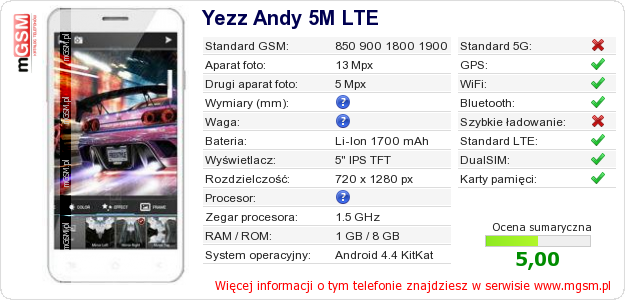 Dane telefonu Yezz Andy 5M LTE na Twojej stronie