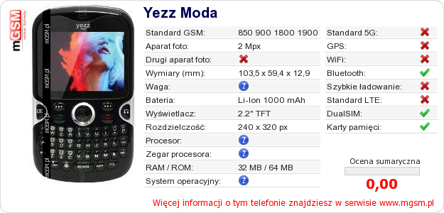 Dane telefonu Yezz Moda na Twojej stronie