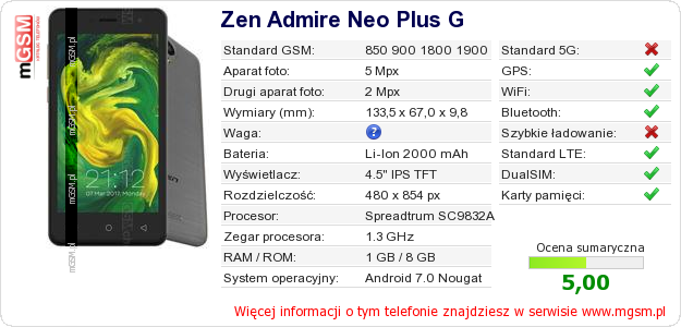 Dane telefonu Zen Admire Neo Plus G na Twojej stronie