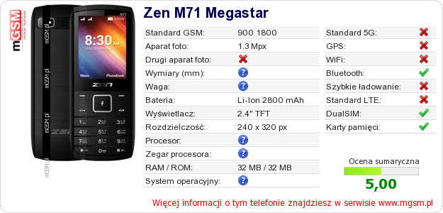 Dane telefonu Zen M71 Megastar na Twojej stronie
