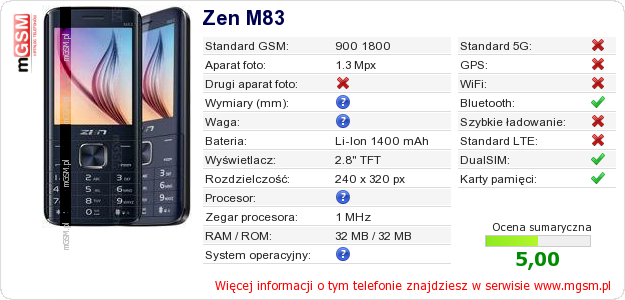 Dane telefonu Zen M83 na Twojej stronie