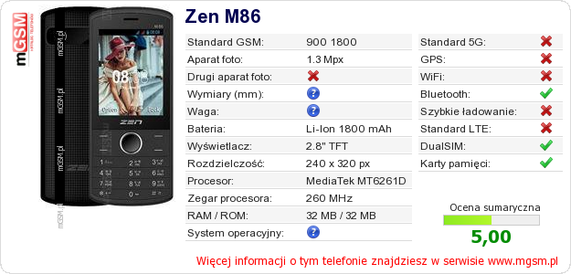 Dane telefonu Zen M86 na Twojej stronie