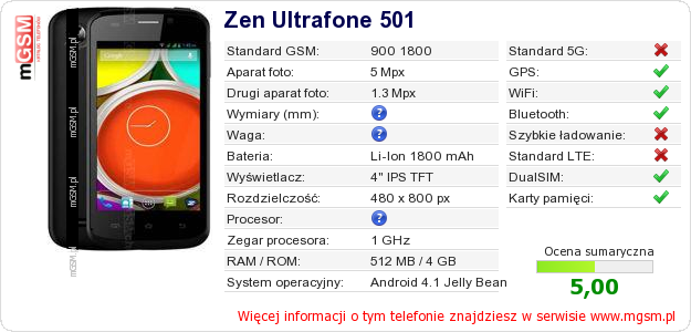 Dane telefonu Zen Ultrafone 501 na Twojej stronie