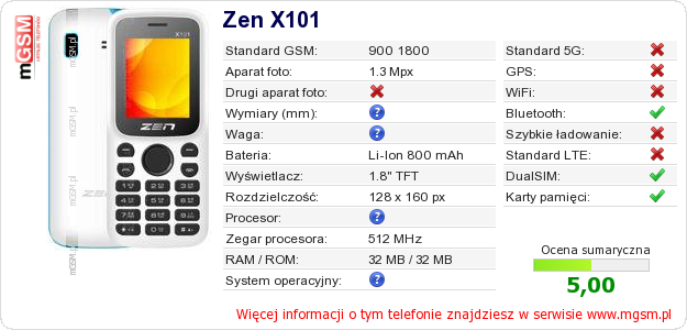 Dane telefonu Zen X101 na Twojej stronie