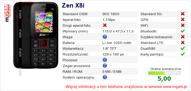 Dane telefonu Zen X8i na Twojej stronie