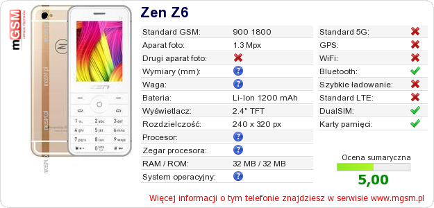 Dane telefonu Zen Z6 na Twojej stronie