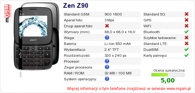 Dane telefonu Zen Z90 na Twojej stronie