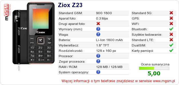 Dane telefonu Ziox Z23 na Twojej stronie