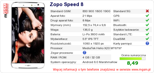 Dane telefonu Zopo Speed 8 na Twojej stronie