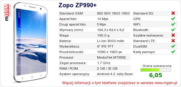 Dane telefonu Zopo ZP990+ na Twojej stronie