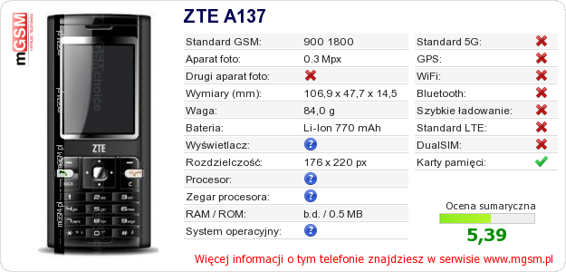 Dane telefonu ZTE A137 na Twojej stronie
