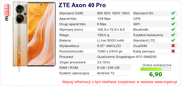 Dane telefonu ZTE Axon 40 Pro na Twojej stronie