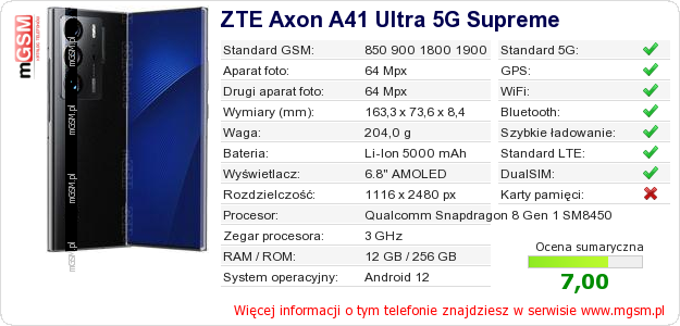 Dane telefonu ZTE Axon A41 Ultra 5G Supreme na Twojej stronie