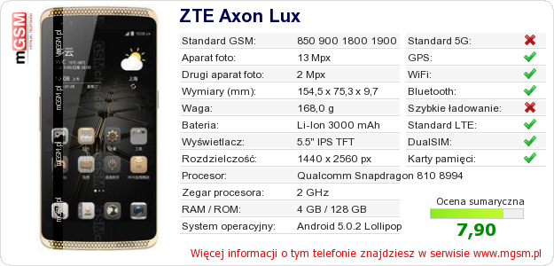 Dane telefonu ZTE Axon Lux na Twojej stronie