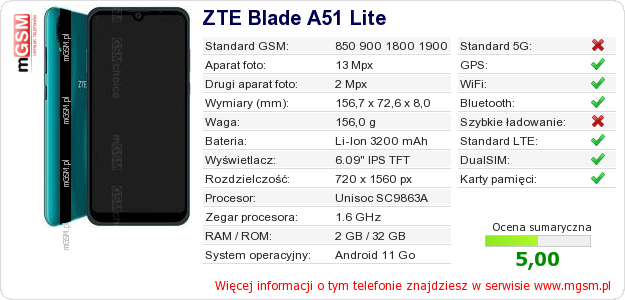 Dane telefonu ZTE Blade A51 Lite na Twojej stronie