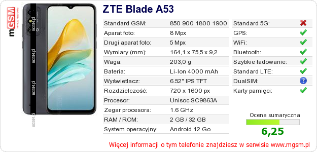 Dane telefonu ZTE Blade A53 na Twojej stronie