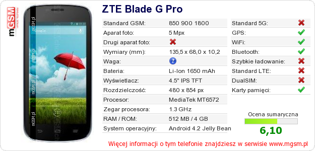 Dane telefonu ZTE Blade G Pro na Twojej stronie