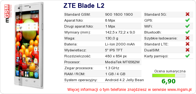 Dane telefonu ZTE Blade L2 na Twojej stronie
