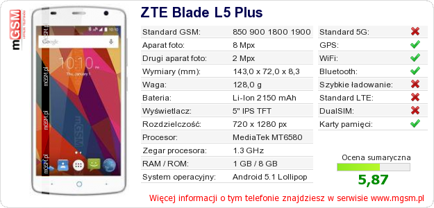 Dane telefonu ZTE Blade L5 Plus na Twojej stronie
