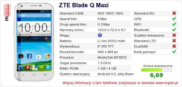 Dane telefonu ZTE Blade Q Maxi na Twojej stronie
