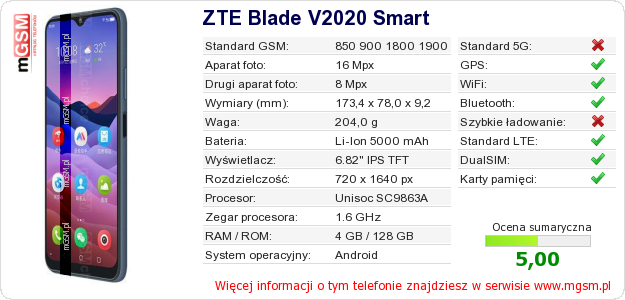Dane telefonu ZTE Blade V2020 Smart na Twojej stronie