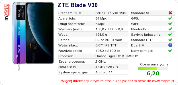 Dane telefonu ZTE Blade V30 na Twojej stronie