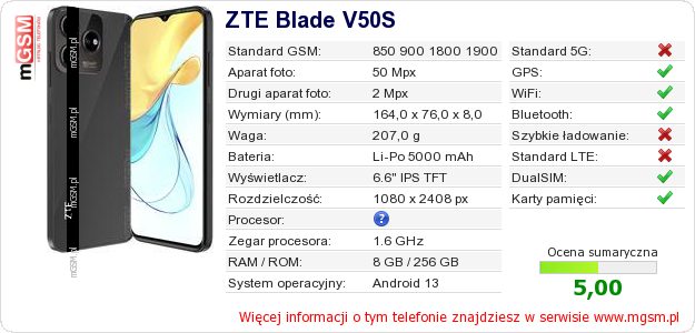 Dane telefonu ZTE Blade V50S na Twojej stronie