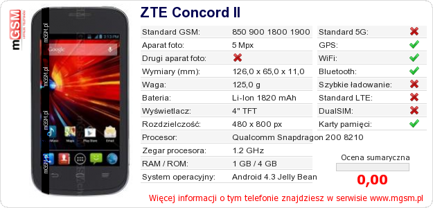 Dane telefonu ZTE Concord II na Twojej stronie