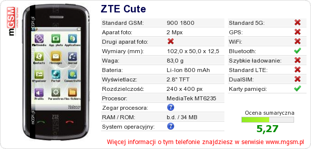 Masz swoją stronę? Chcesz wstawić gdzieś informacje o podstawowych danych telefonu ZTE Cute ? To bardzo proste. Możesz pobrać obrazek, lub skopiować i wkleić na stronę poniższy kod:Wklejenie tego kodu spowoduje wyświetlenie poniższego obrazka: