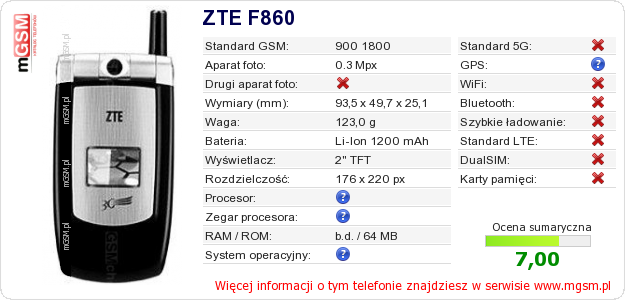Dane telefonu ZTE F860 na Twojej stronie